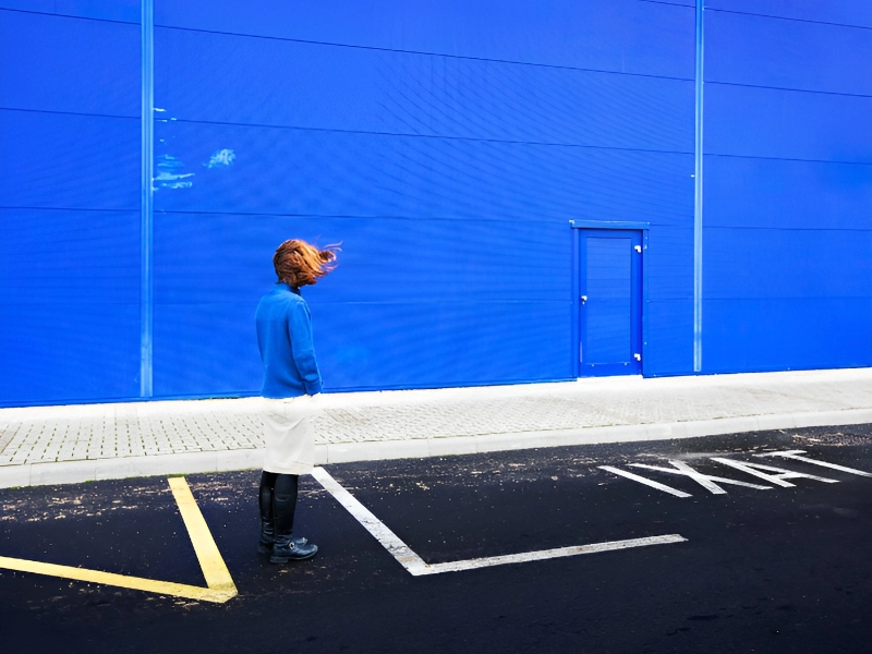 Nur das Haar muss noch blau gefärbt werden, aber selbst ohne diesen letzten Schliff ist die Verwandlung bereits faszinierend. Das Motiv verschwindet fast im leuchtenden blauen Hintergrund und erzeugt eine nahezu nahtlose Illusion. Dieses Bild demonstriert perfekt, wie eine einfache Farbübereinstimmung eine gewöhnliche Szene in ein spielerisches Beispiel für Tarnungskunst verwandeln kann und die Grenze zwischen Person und Umgebung verwischt.