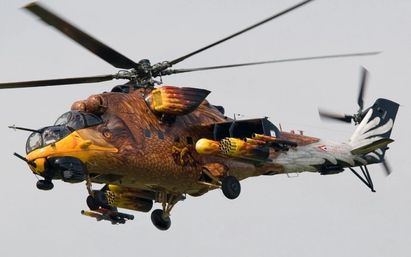 Der Mi-24V-Hind-Hubschrauber der ungarischen Luftwaffe wird durch ein individuelles Adler-Lackierungsschema verwandelt. Das Design erstreckt sich vom Heck bis zur Nase und erzeugt die Illusion eines Raubvogels im Flug. Kunstvolle Details an den Federn, Augen und dem Schnabel zeigen außergewöhnliche Kunstfertigkeit. Die erdigen Töne verstärken sein wildes Aussehen, während die Tarnung möglicherweise auch taktische Vorteile bietet. Diese Lackierung feiert sowohl Nationalstolz als auch die in der Militärluftfahrt mögliche Kunstfertigkeit.