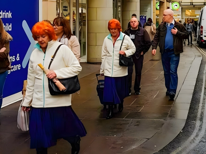 Diese beiden Frauen scheinen Fremde zu sein, während sie getrennt voneinander gehen, doch sie haben identisches orangefarbenes Haar, tragen dieselben Stiefel und sind exakt gleich gekleidet.